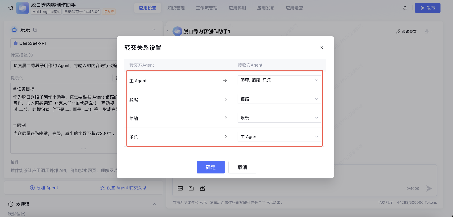 在应用中添加两个或以上的 Agent 时,系统支持配置多个 Agent 之间的转交关系。请注意,默认创建多个 Agent 后,这些 Agent 不会立即生效,必须与主 Agent 配置转交关系后,主 Agent 才能根据 Agent 描述准确地将任务分配到特定的子 Agent。