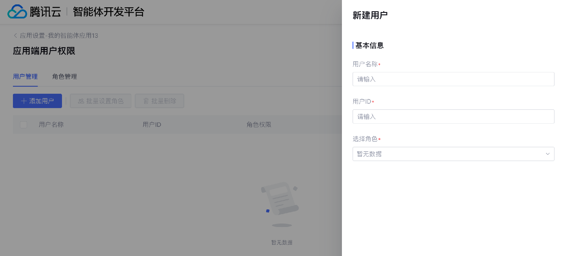 在用户管理中添加用户 ID 和用户名称,为用户选择角色。应用端该用户咨询时,按角色权限的知识范围回复该用户。