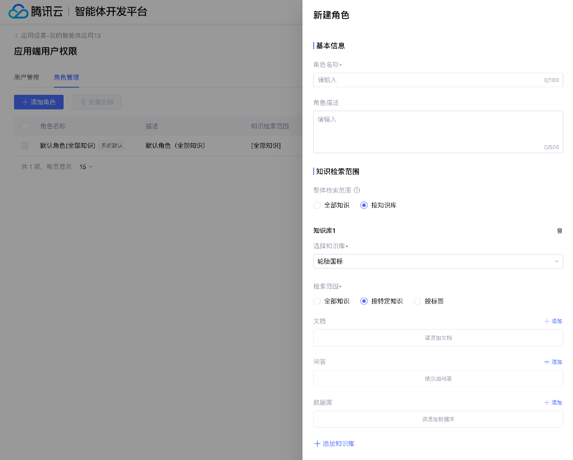 用于定义角色及其对应的知识范围合集。默认提供一个可访问全部知识范围的角色。支持新建角色并为其选择知识检索范围,例如: