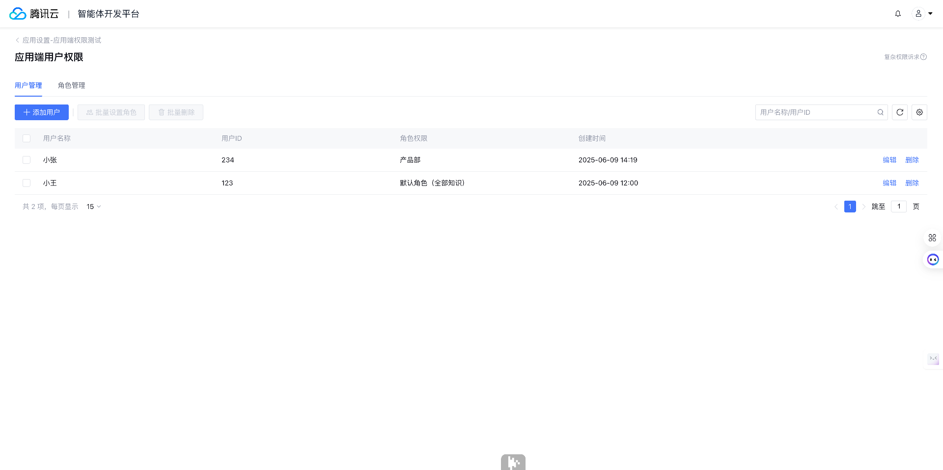 通过 用户管理 和 角色管理 在平台内完成应用端用户权限控制。整体思路是:创建角色,为角色配置可访问的知识范围,再将应用端用户绑定至角色;用户提问时,系统在角色设置的知识范围内进行检索。