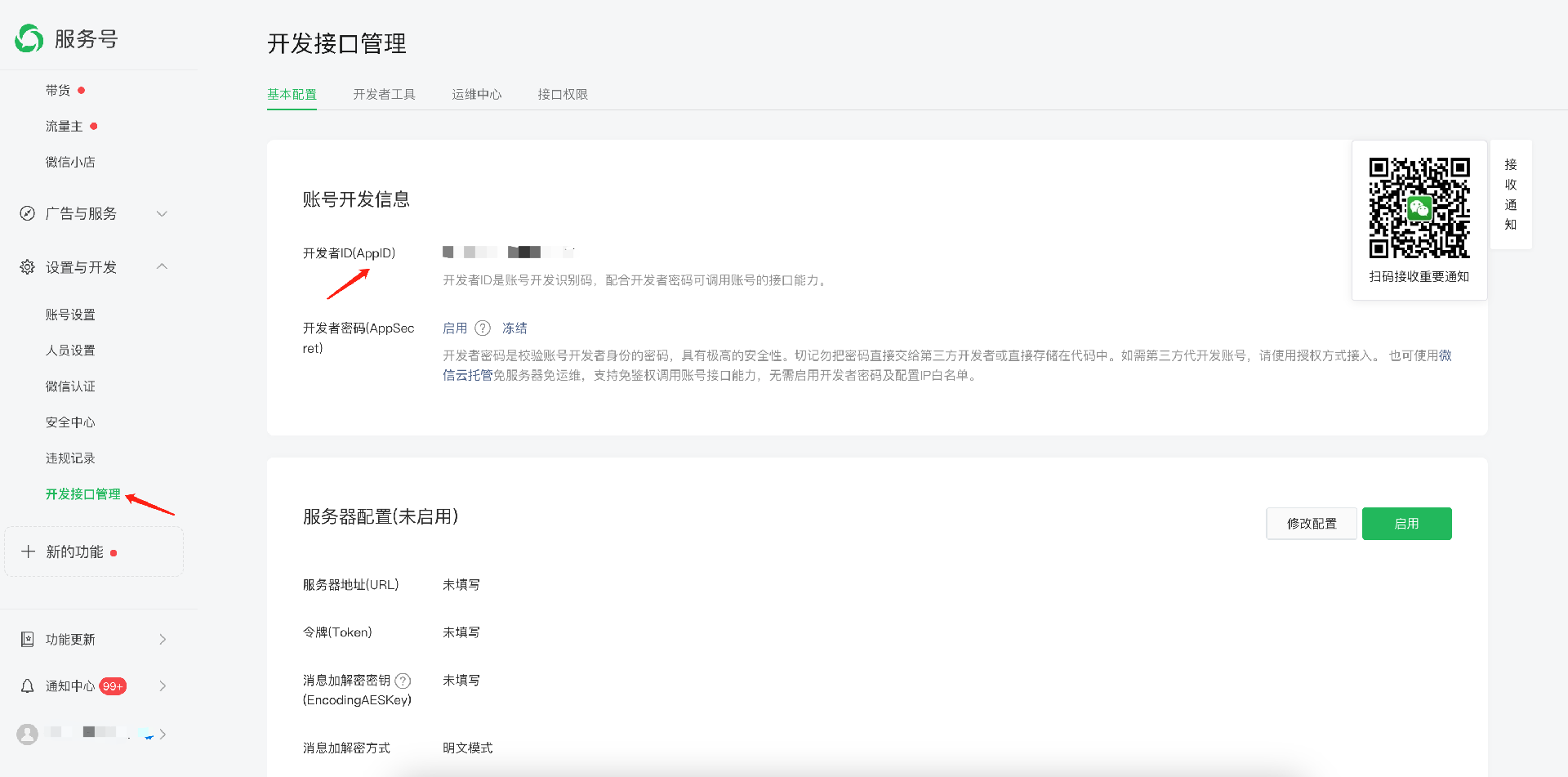 1. 访问 微信公众平台 并登录您的服务号或订阅号。2. 在设置与开发 > 开发接口管理 > 基本配置页面,复制开发者 ID(AppID)。