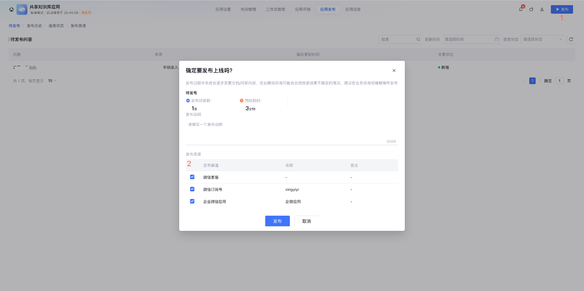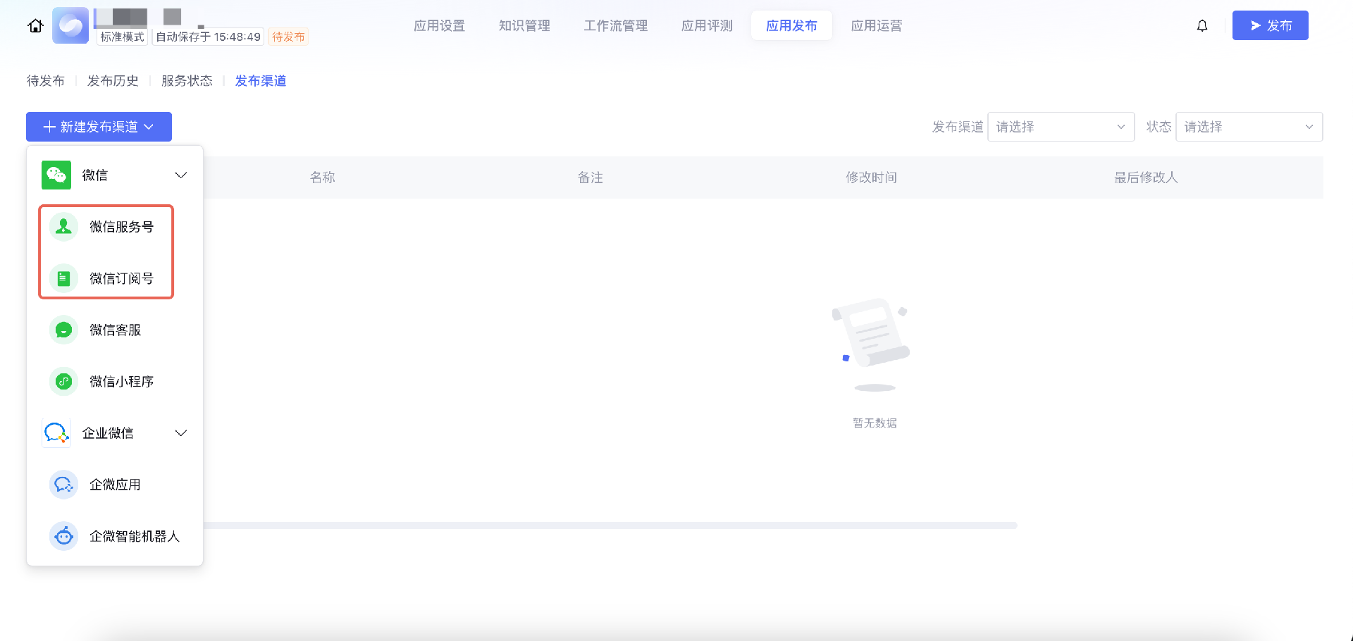 6. 发布应用时选择微信公众号渠道。成功发布后,您可以前往微信公众号与智能体对话。