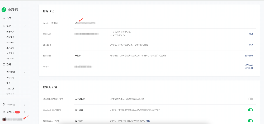 2. 单击左下角小程序头像 > 账号设置 > 账号信息 > AppID(小程序 ID) 复制开发者 ID(AppID)
