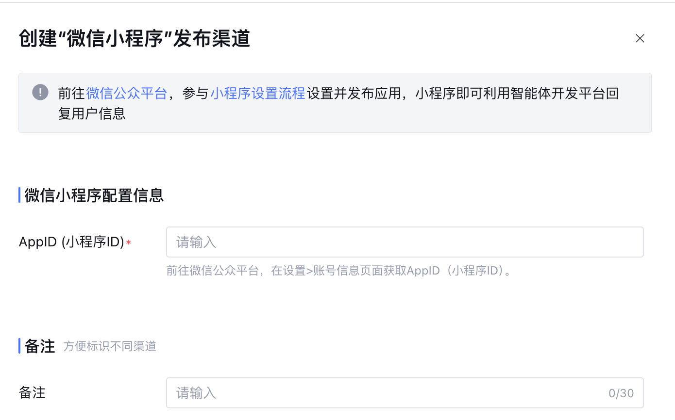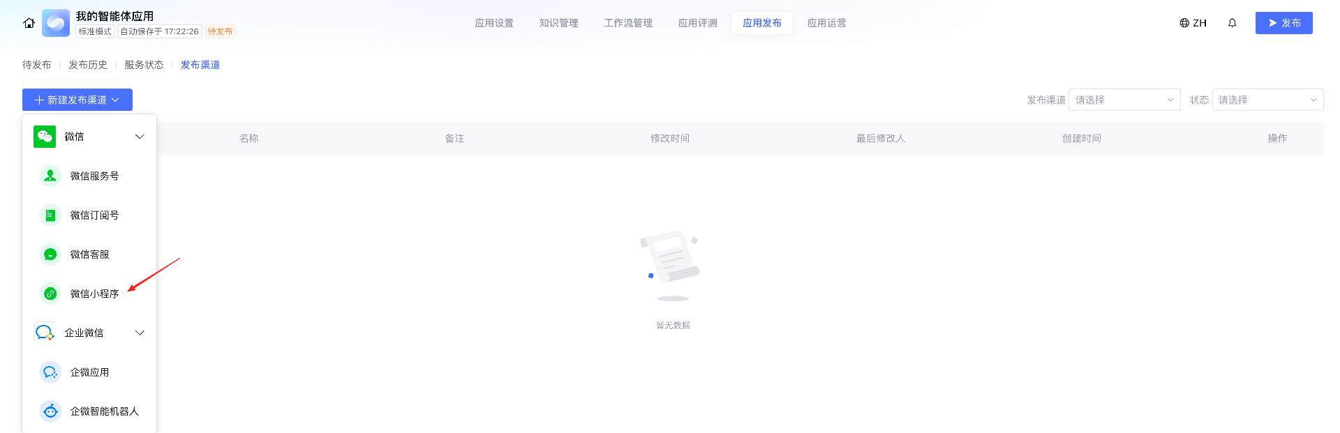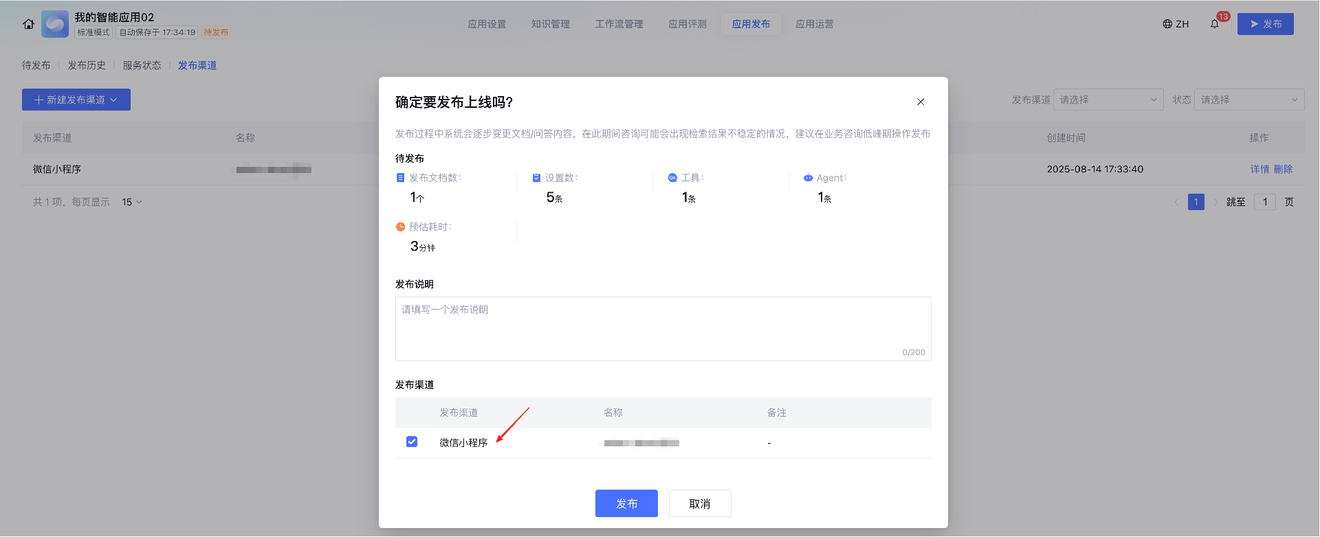 5. 发布应用时选择微信小程序渠道。成功发布后,您可以前往微信小程序与智能体对话。
