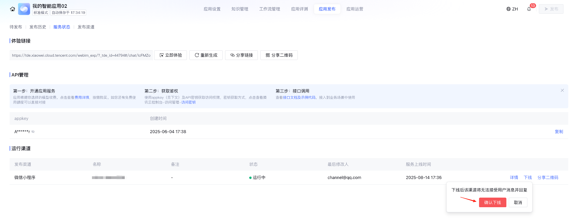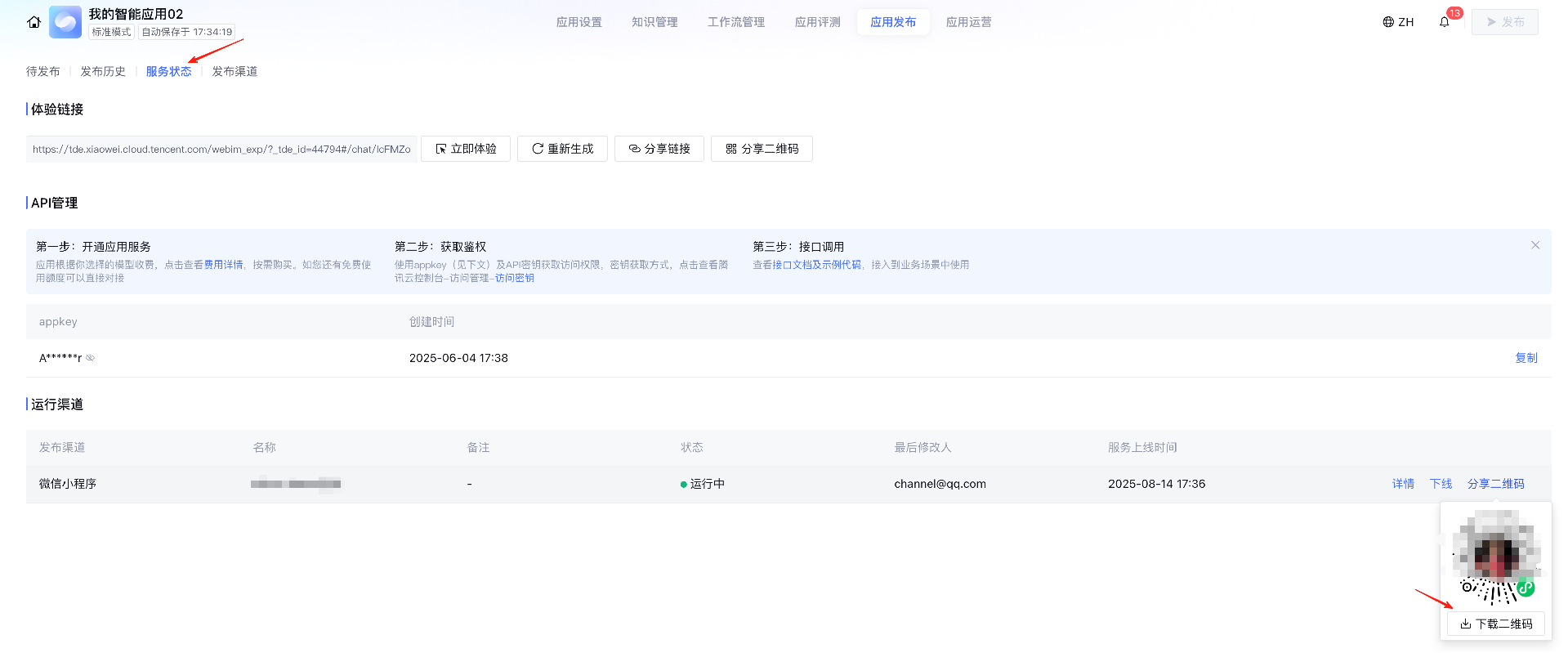 单击服务状态> 运行渠道 > 分享二维码,可以获取对应的小程序二维码,实现通过微信扫码和大模型对话。