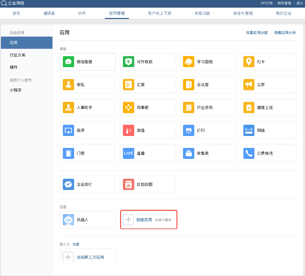 1. 登录 企业微信平台,进入应用管理 > 应用,单击创建应用。