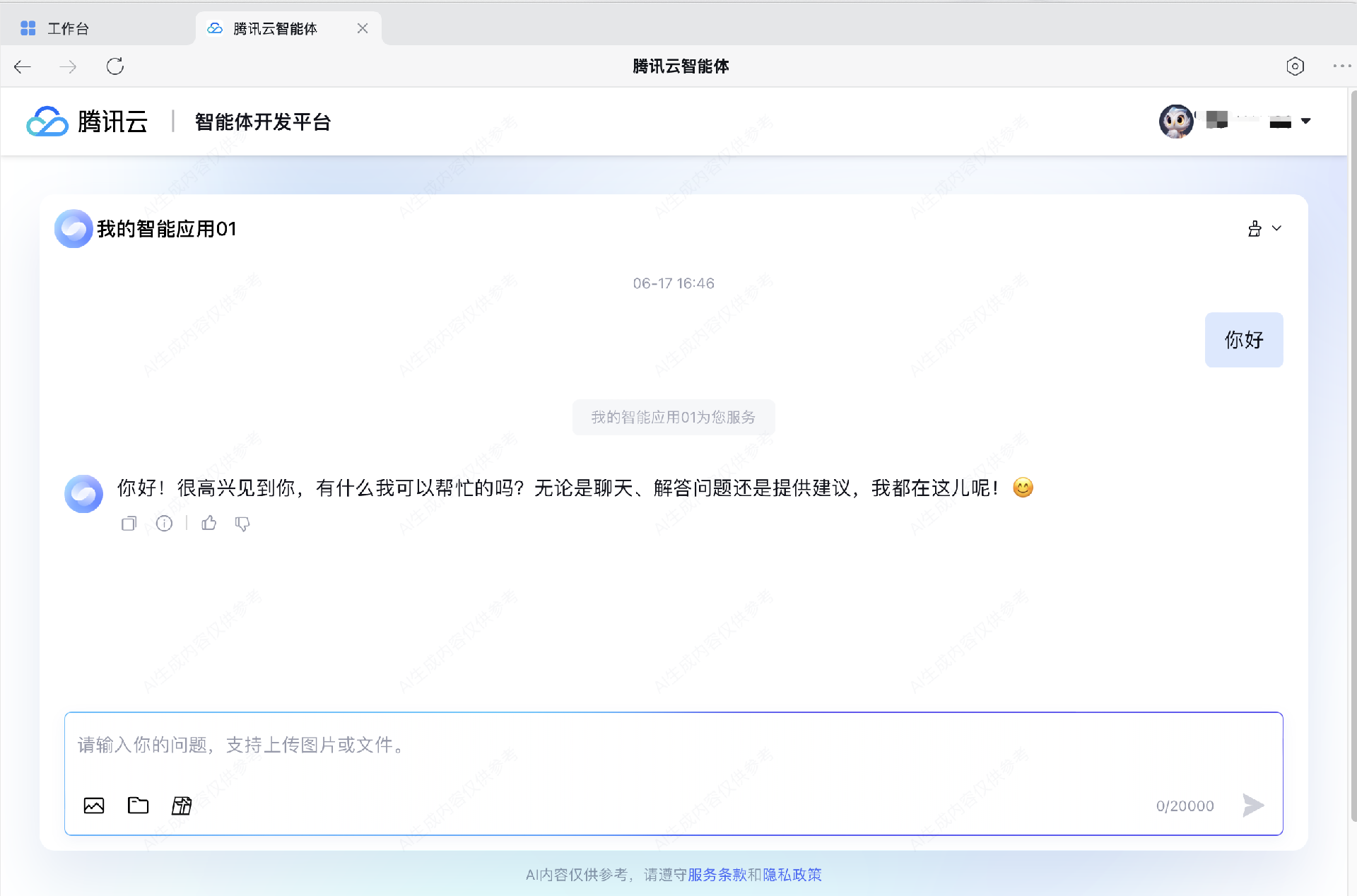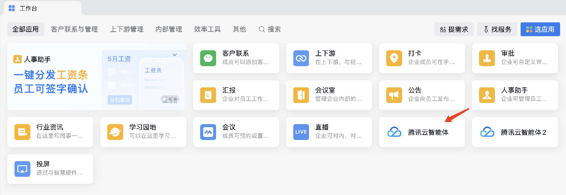 1. 在企业微信工作台中,点击腾讯云智能体应用后可以开始对话。