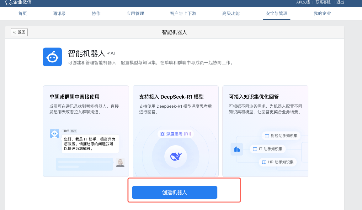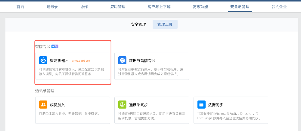 1. 登录 企业微信管理后台,进入安全与管理 > 管理工具 ,点击智能机器人。