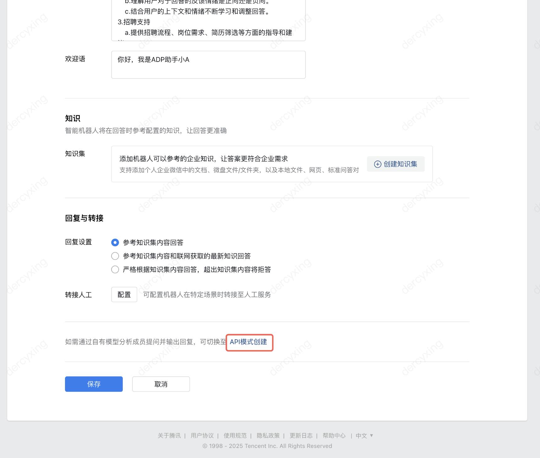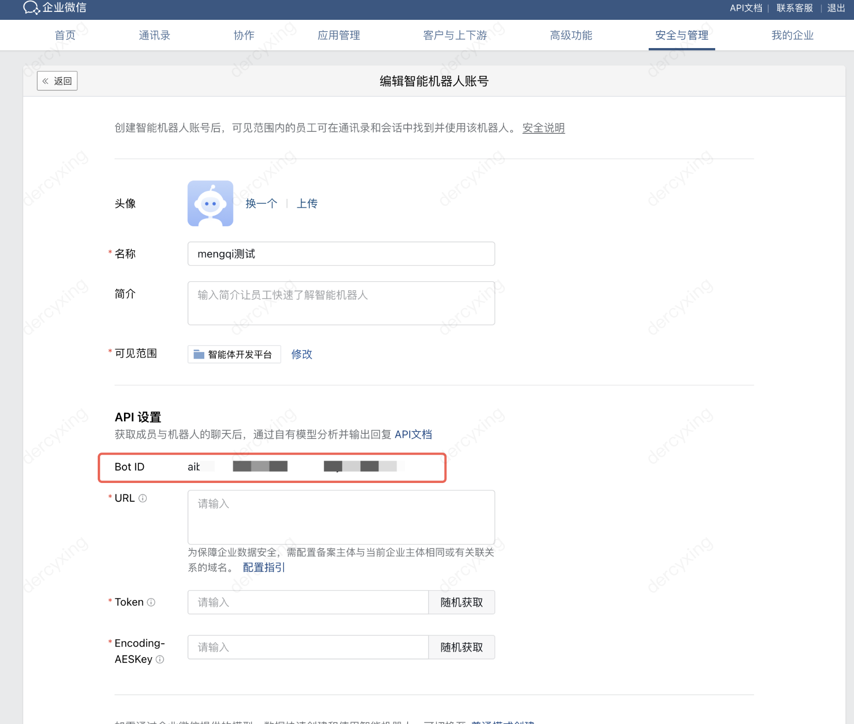 2. 在企业微信管理后台智能机器人的编辑页面(参考步骤三),在 API 模式下填入智能体开发平台中获取的参数信息。