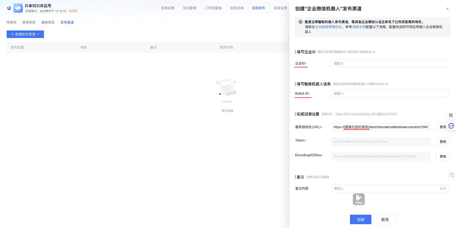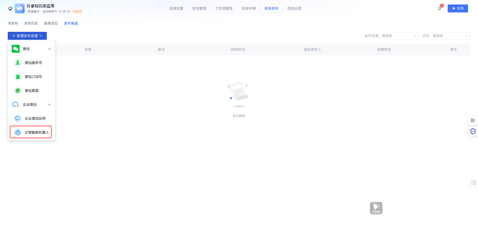 1. 登录 智能体开发平台,进入应用开发 > 查看应用 > 应用发布 > 发布渠道,单击新建发布渠道,选择企微智能机器人。