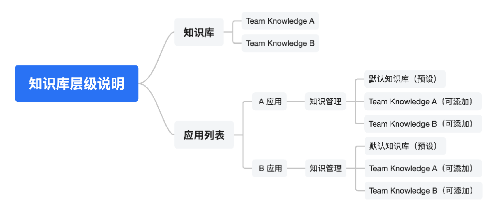 团队成员都可以在平台内的知识库上传和维护知识。在具体应用中,每个应用自带 知识管理 功能模块,内设默认知识库,仅限当前应用使用,不支持跨应用共享;如果需要复用其他知识内容,可以在应用的知识管理中额外添加平台级知识库。既能保证应用的独立性,又能支持知识在不同应用之间共享和复用。