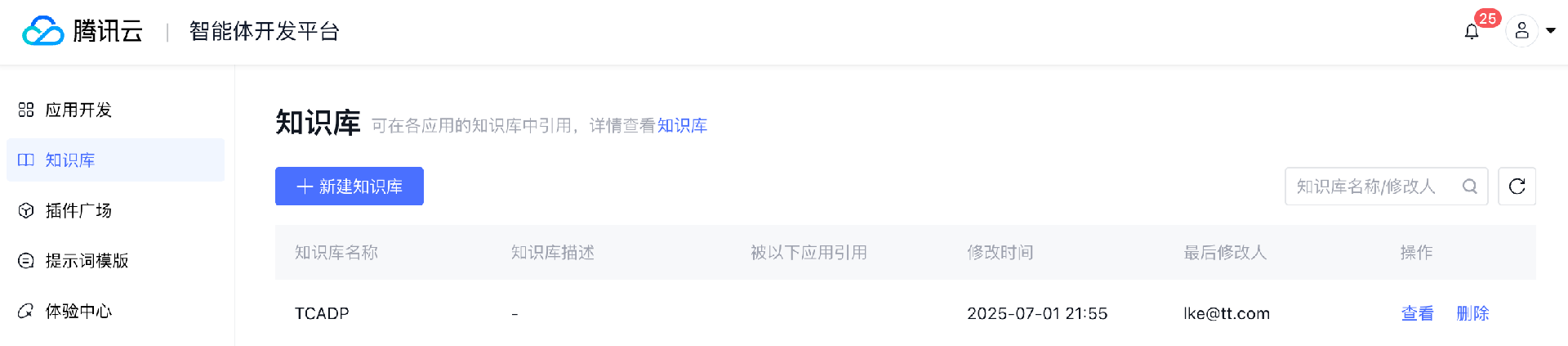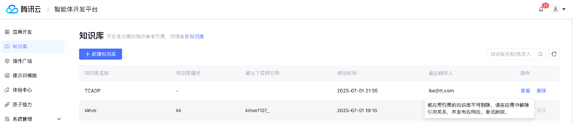 如需删除知识库,请确保当前知识库未被任何应用所引用;被应用引用的知识库需要先解除引用关系后删除。