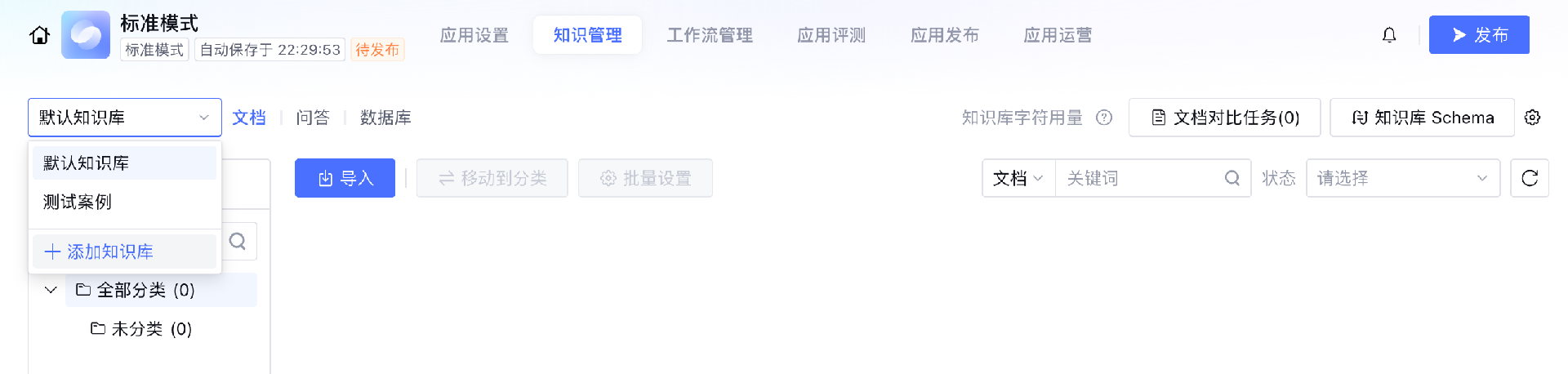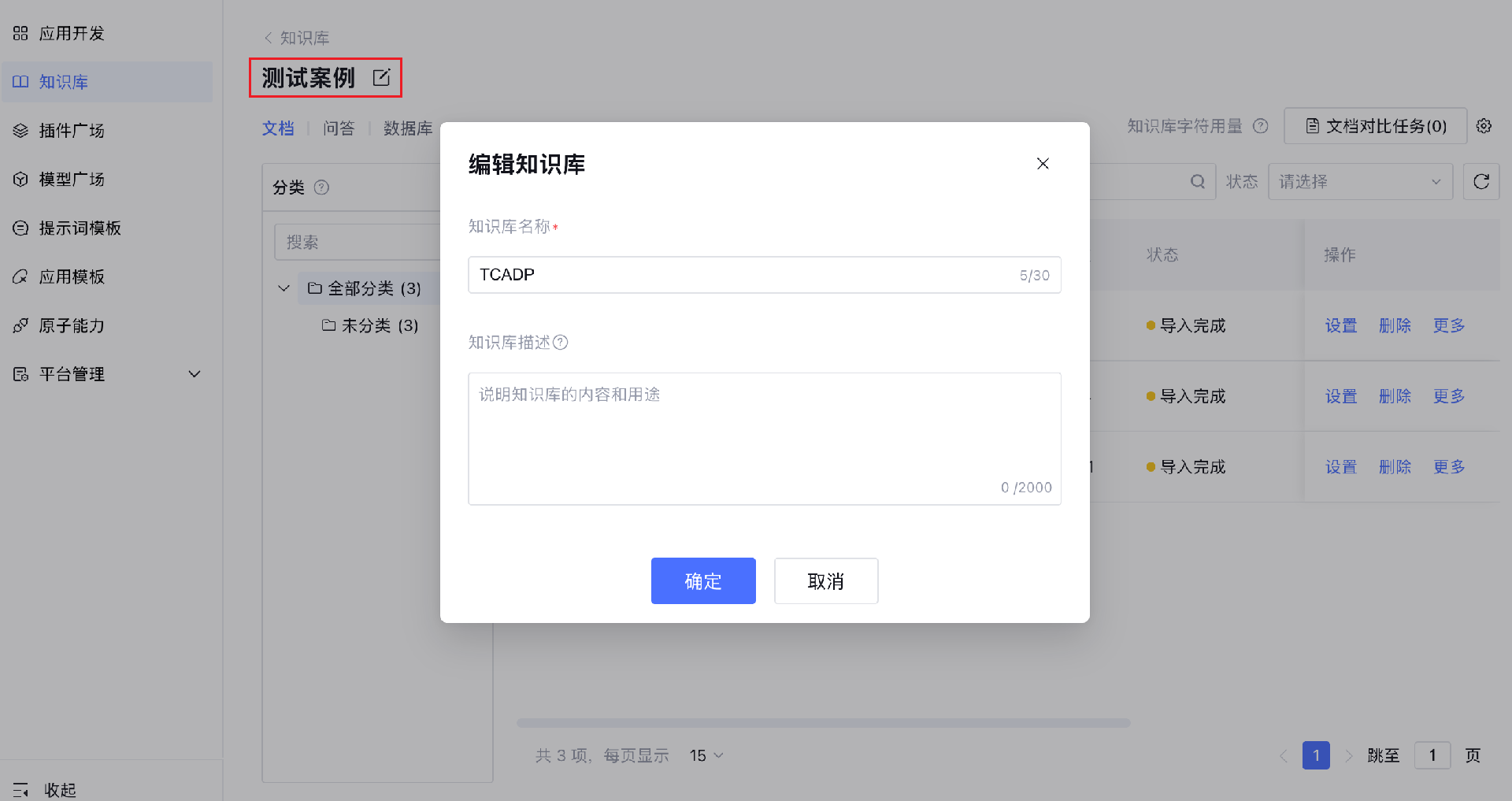 2. 知识库支持导入文档、问答和数据库。与应用中知识管理的默认知识库所支持的范围相一致,当知识状态为“导入完成”即可生效。