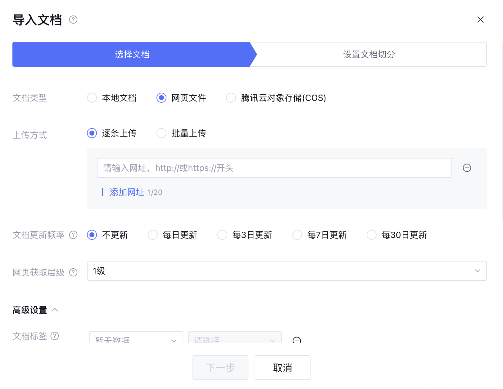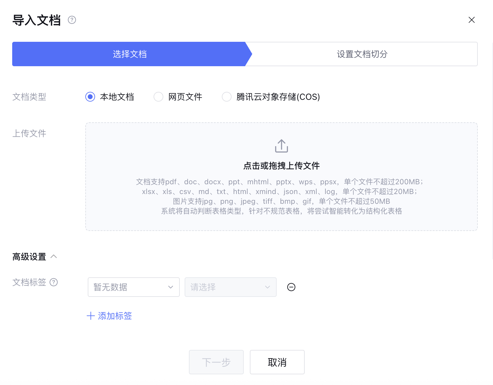 您可以通过本地文档、网页文件、腾讯文档和腾讯云对象存储(COS)四种方式导入文档。