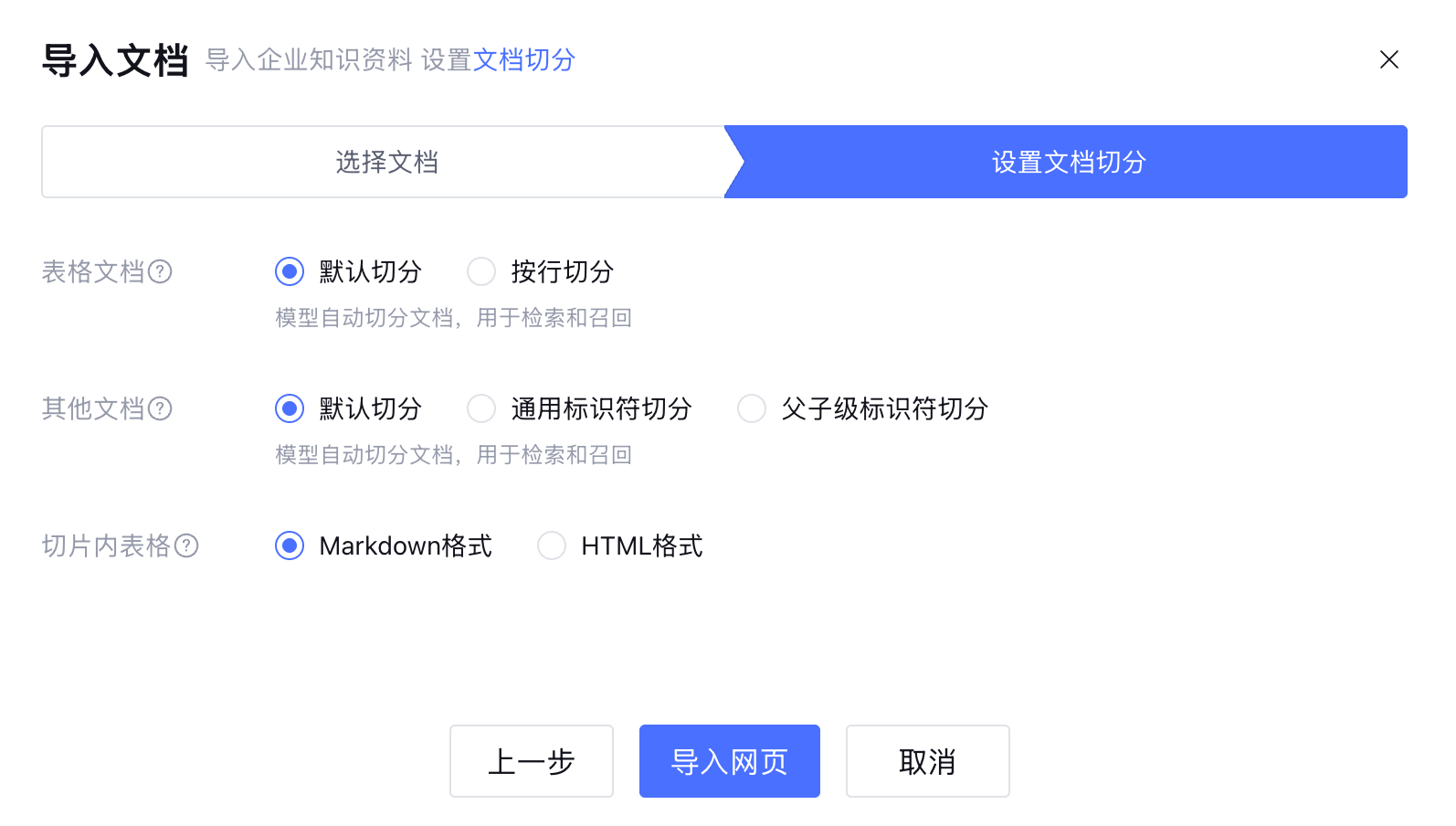 4. 设置文档切分规则,通过 设置文档切分 了解如何切分文档,完成后单击导入网页。