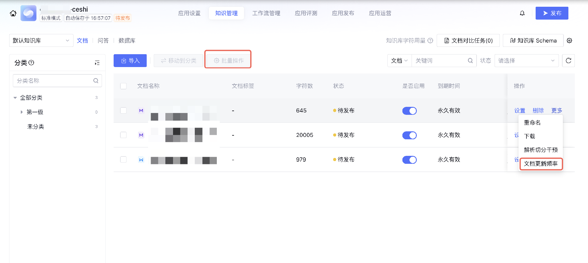 1. 进入知识库详情页,选择知识库 > 文档,进入文档管理界面。