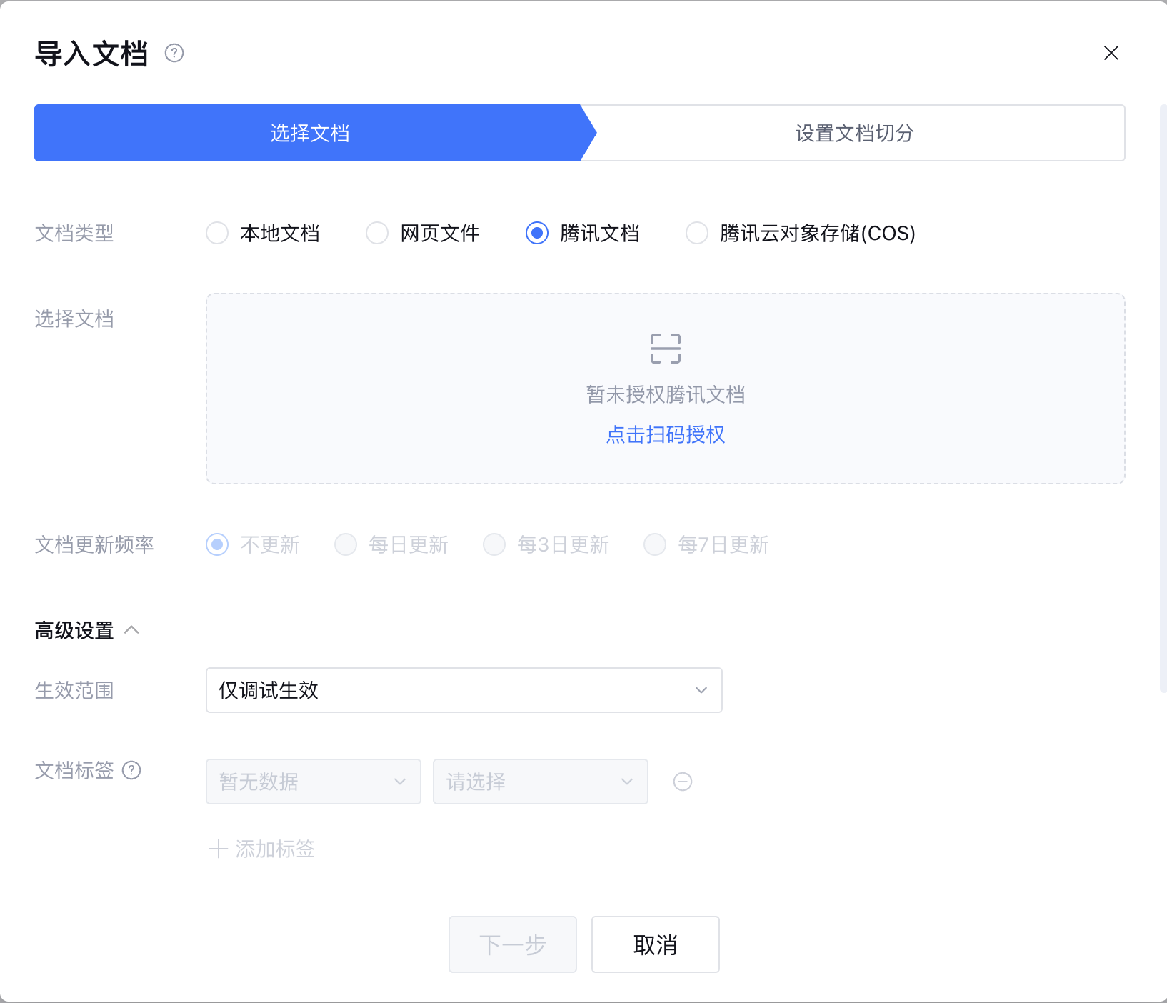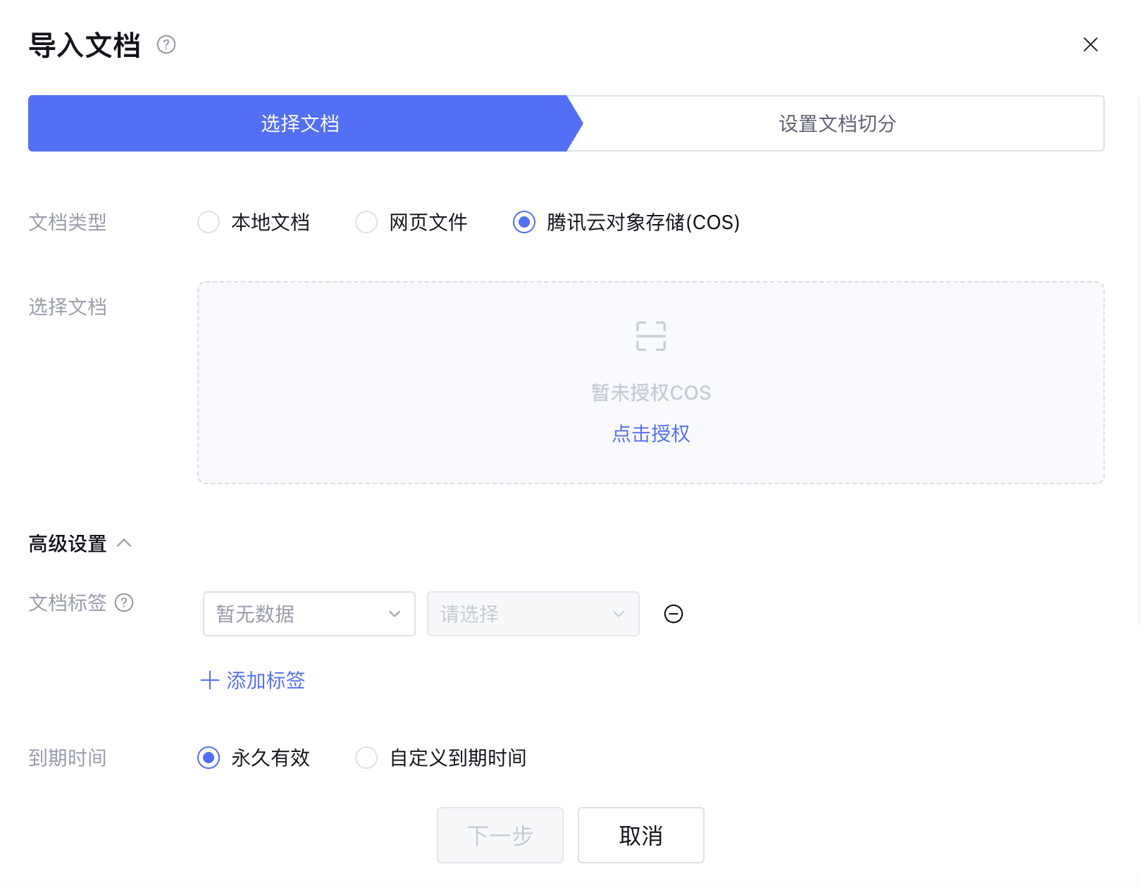 3. 根据页面提示,完成 COS 授权后选择需要导入的文档。