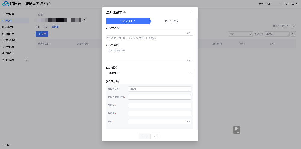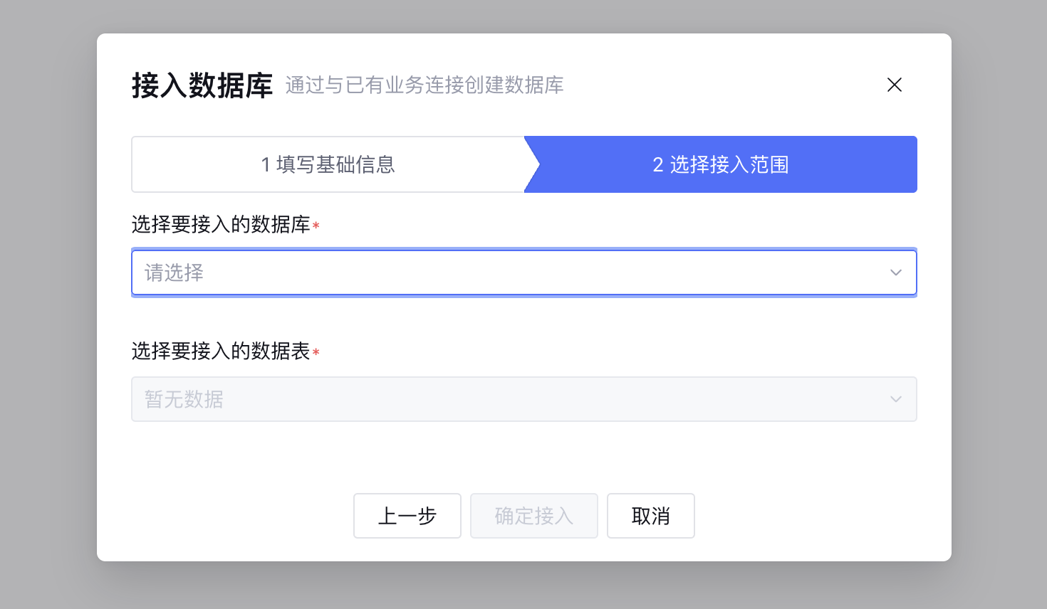 3. 基础信息填写完成后,单击下一步,可选择接入范围,即:选择要接入的数据库、数据表。之后单击确定接入即可接入数据库。