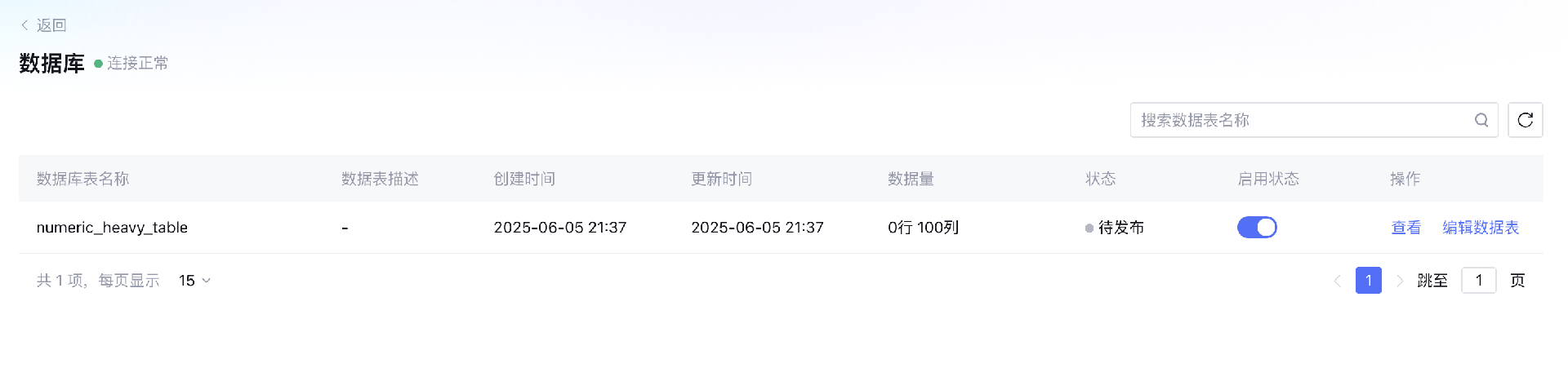 查看数据库:点击查看数据库,进入到数据表列表页。列表支持查看数据库表名称、数据表描述、创建时间、更新时间、数据量、发布状态、启用状态。