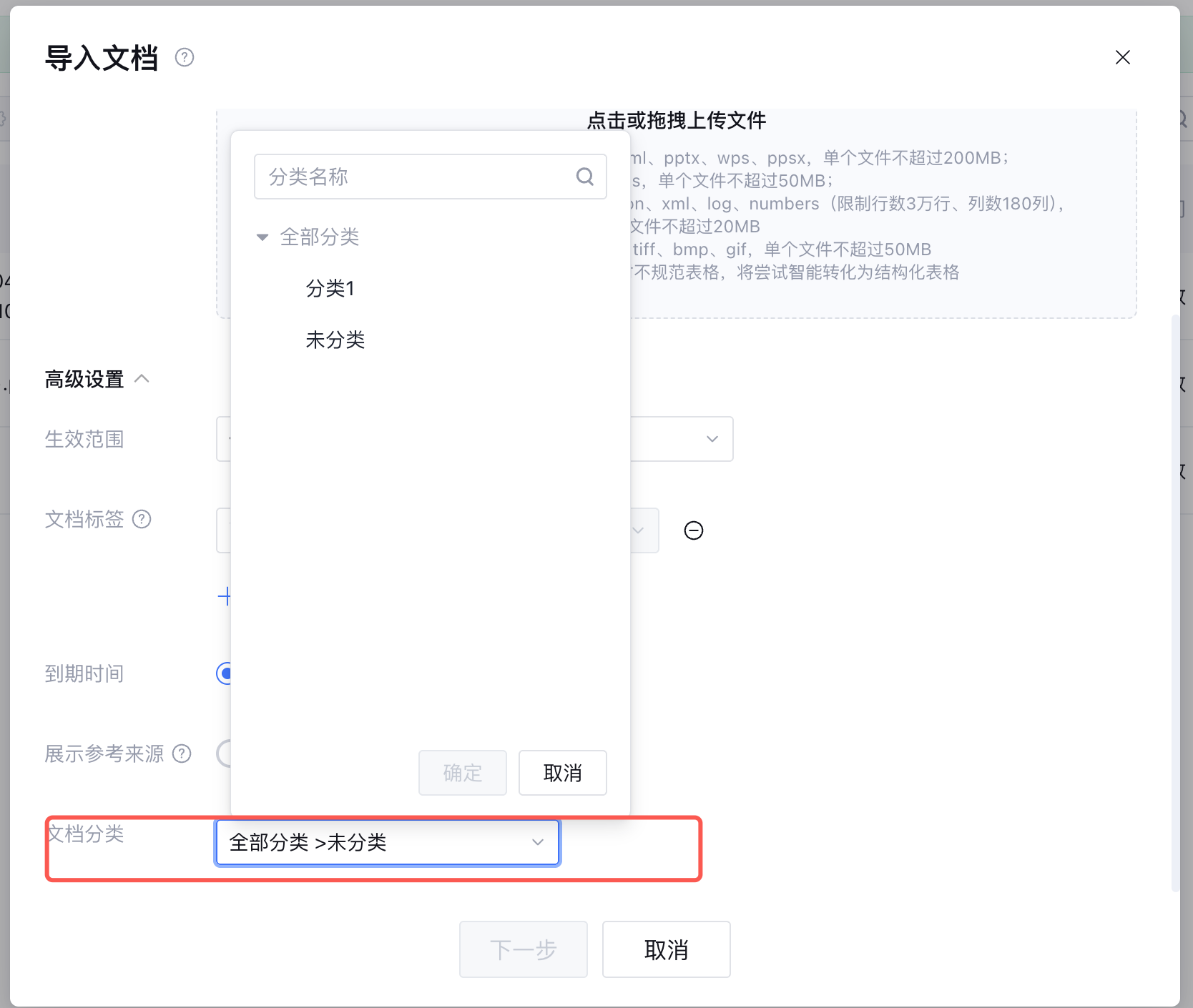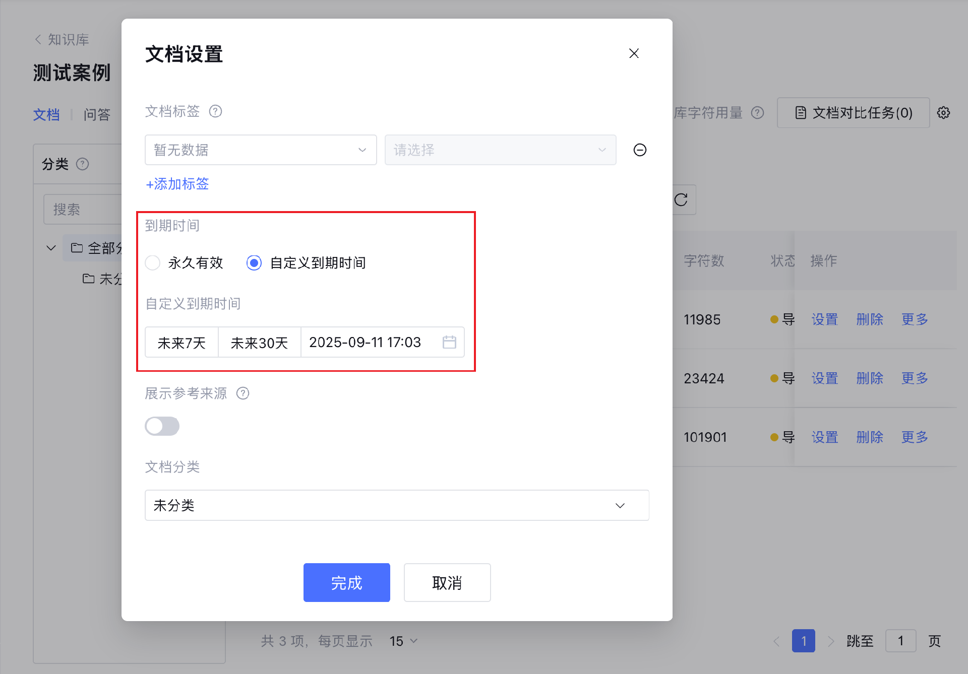 您可以调整文档的到期时间,文档到期后将无法被智能体应用读取使用。默认提供未来 7 天,未来 30 天和自定义到期时间。单击文档设置 > 到期时间进行调整。