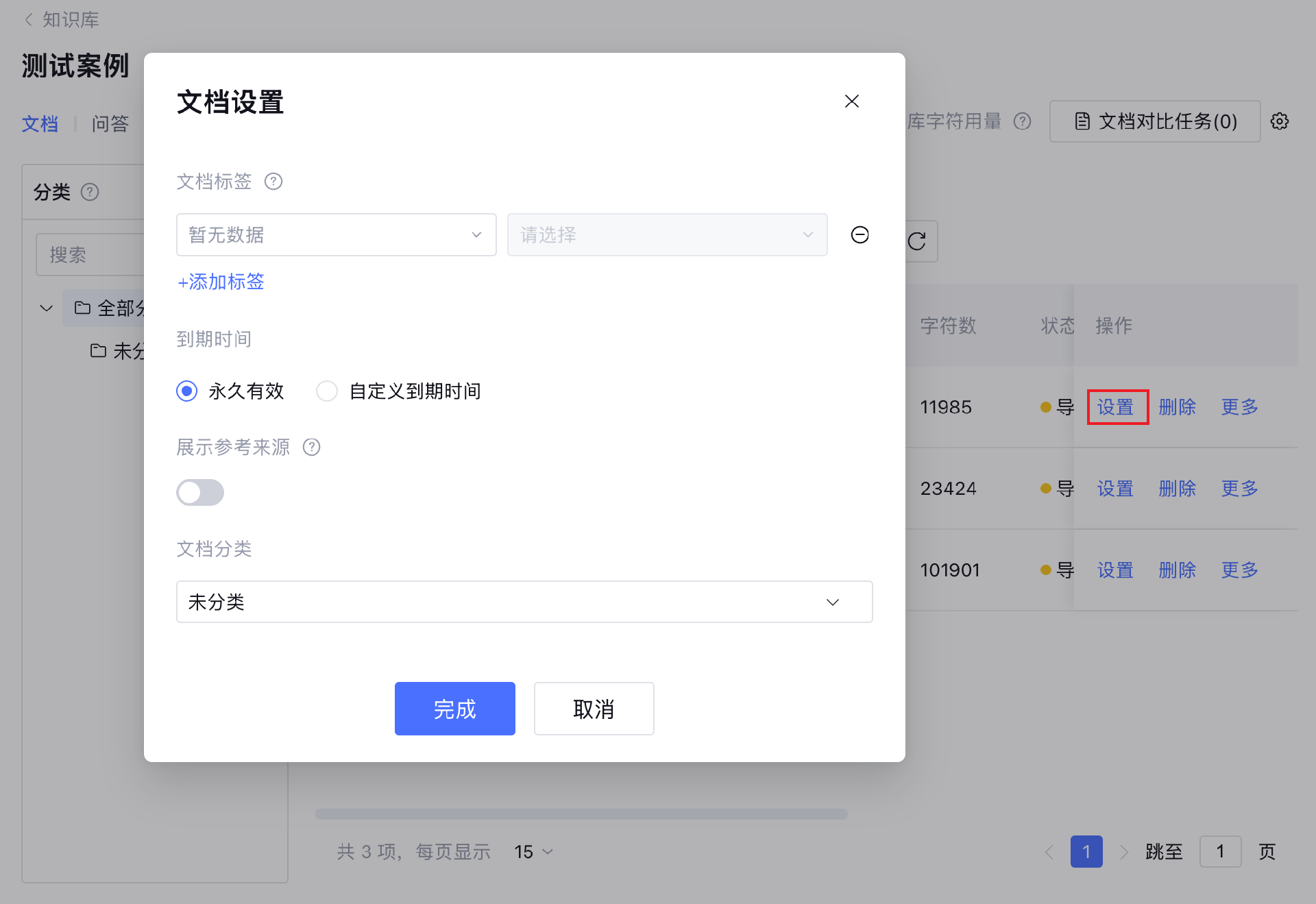 在知识库页面,单击文档右侧的设置,您可以根据业务需求对文档进行精细化管理,包括:调整文档标签以便于检索与标记、设置文档的到期时间以实现生命周期管理、配置是否在回答中展示参考来源,以及修改文档分类以优化知识的组织结构。