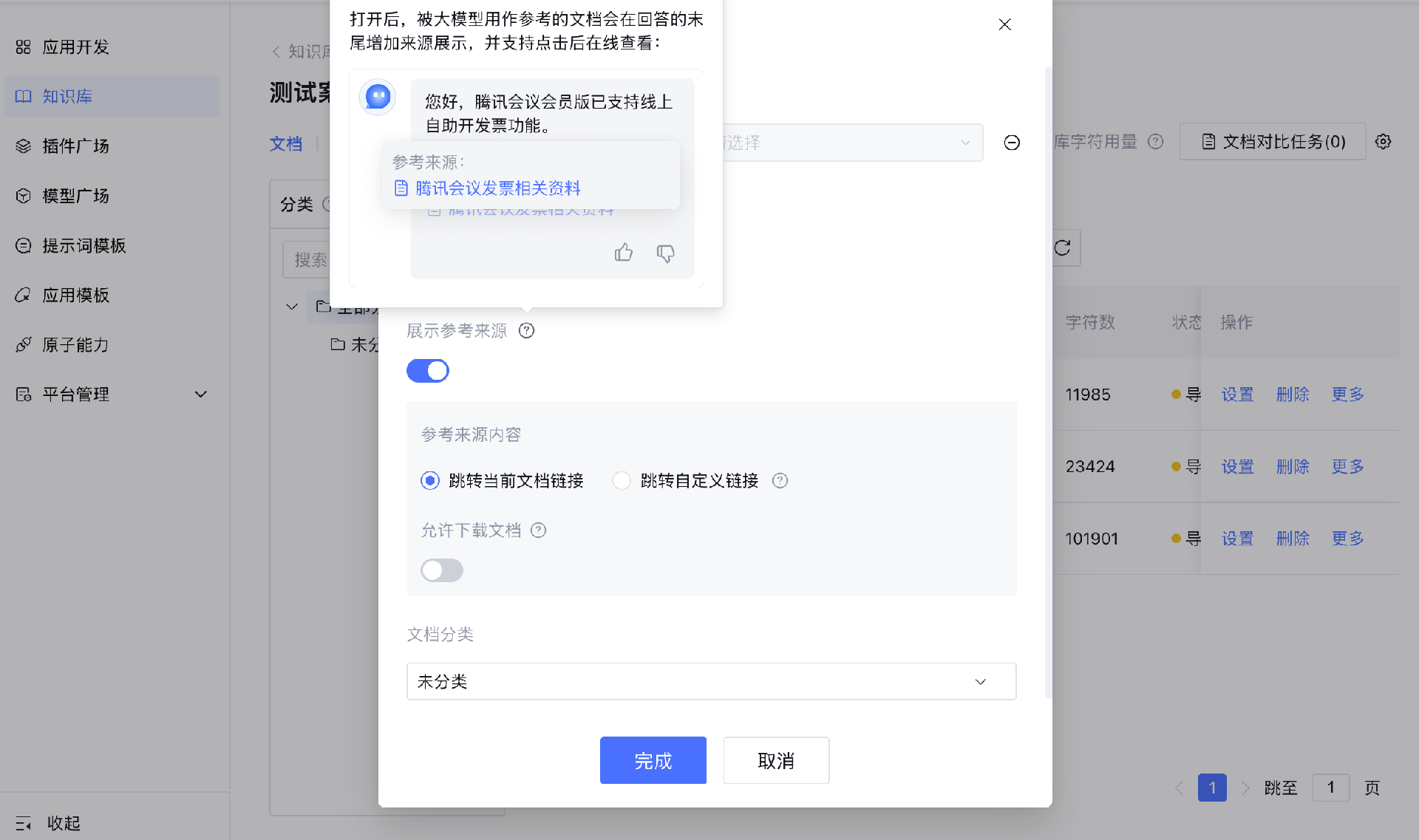跳转自定义链接:支持您自定义填入链接,在发布后的体验链接中,点击参考来源文档的查看原文按钮后,将跳转到您配置的外部链接,适用于需要统一展示到业务系统或官方站点的场景。