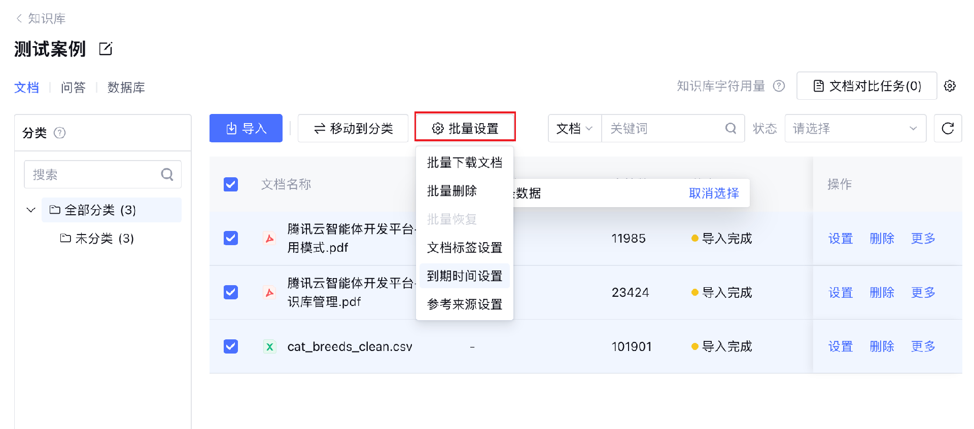 您可以批量选中多个文档后,统一执行相关操作。例如,可以将文档批量移动至指定分类,便于结构化管理;也可以通过批量设置功能,对多个文档同时进行下载、删除、标签调整、到期时间配置以及参考来源展示设置,从而提升文档管理效率。