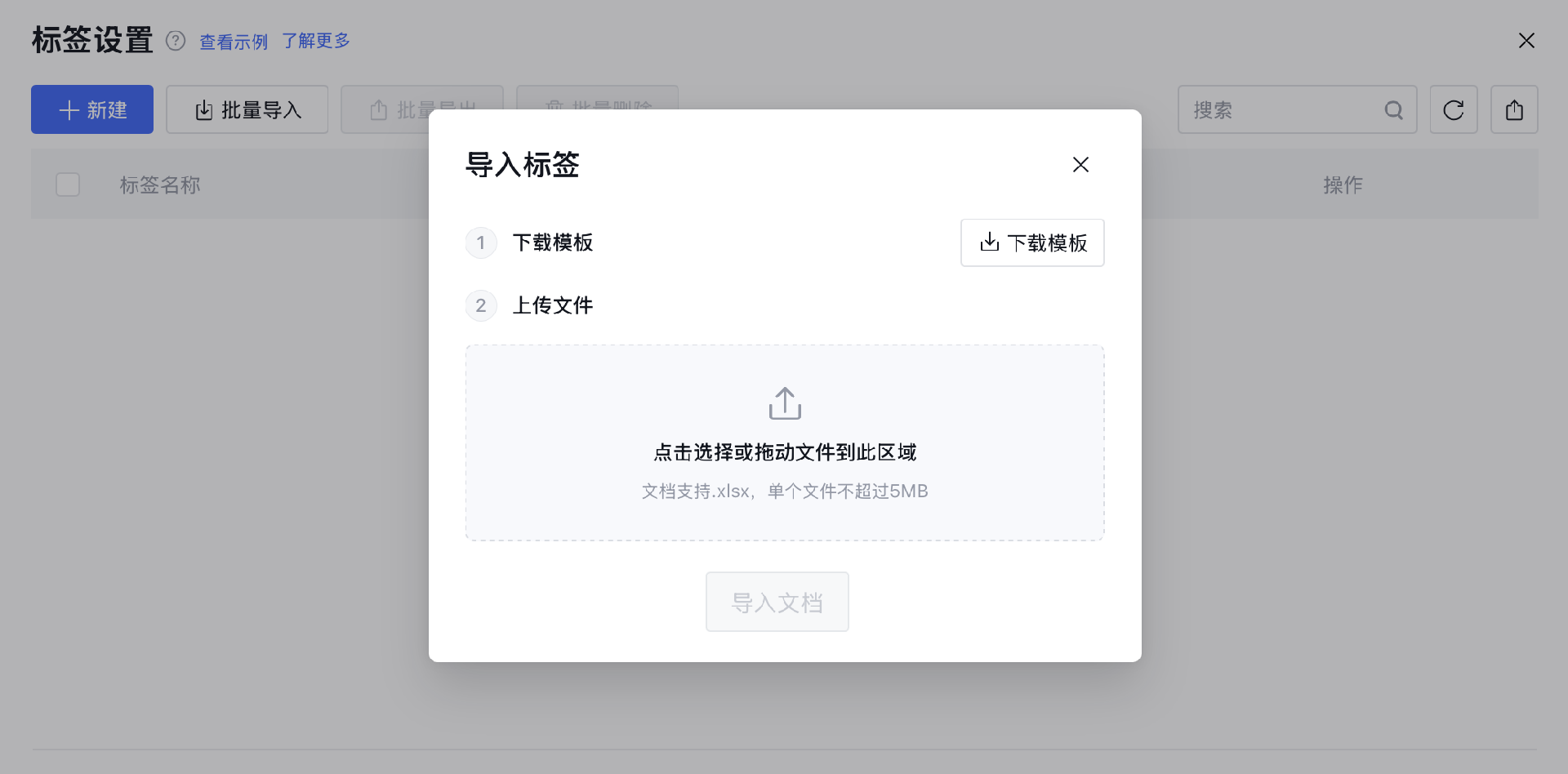 下载 模板文件,根据指引填写标签内容,填写完成之后,通过文件上传,单击导入文档,将标签批量导入标签管理。