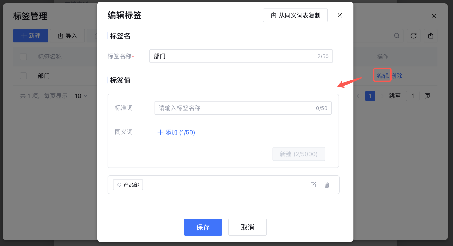 点击编辑进入编辑标签页面,支持修改标签名称和标签值。如修改的标签被文档/问答使用,需要发布后在发布环境中生效。