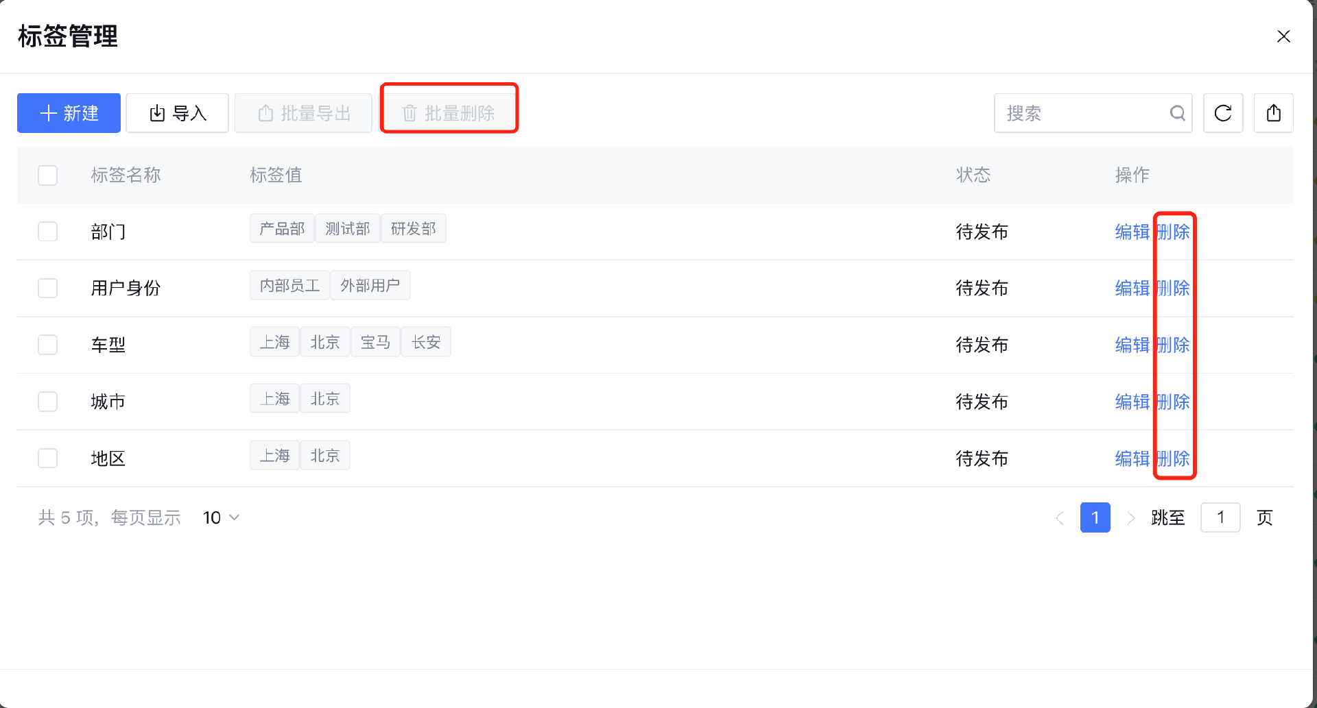 支持逐个删除和批量删除标签。当标签被文档/问答使用后,不支持删除。