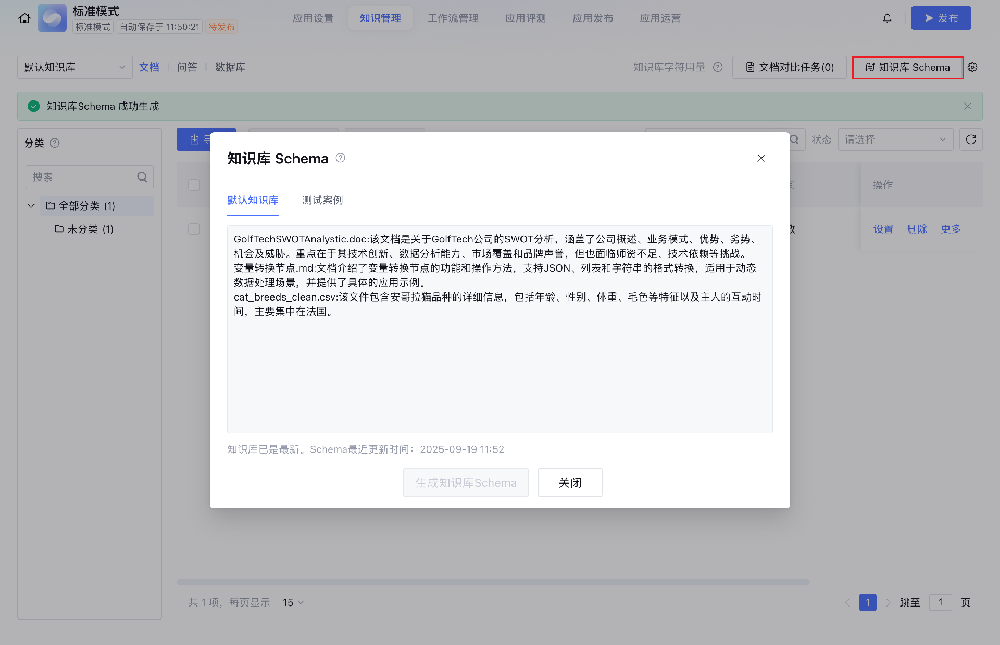 知识库检索 Agent 的运行依赖于知识库 Schema。单击应用 > 知识管理,手动点击知识库 Schema。生成 Schema 后,可分别查看各知识库的 Schema 信息。