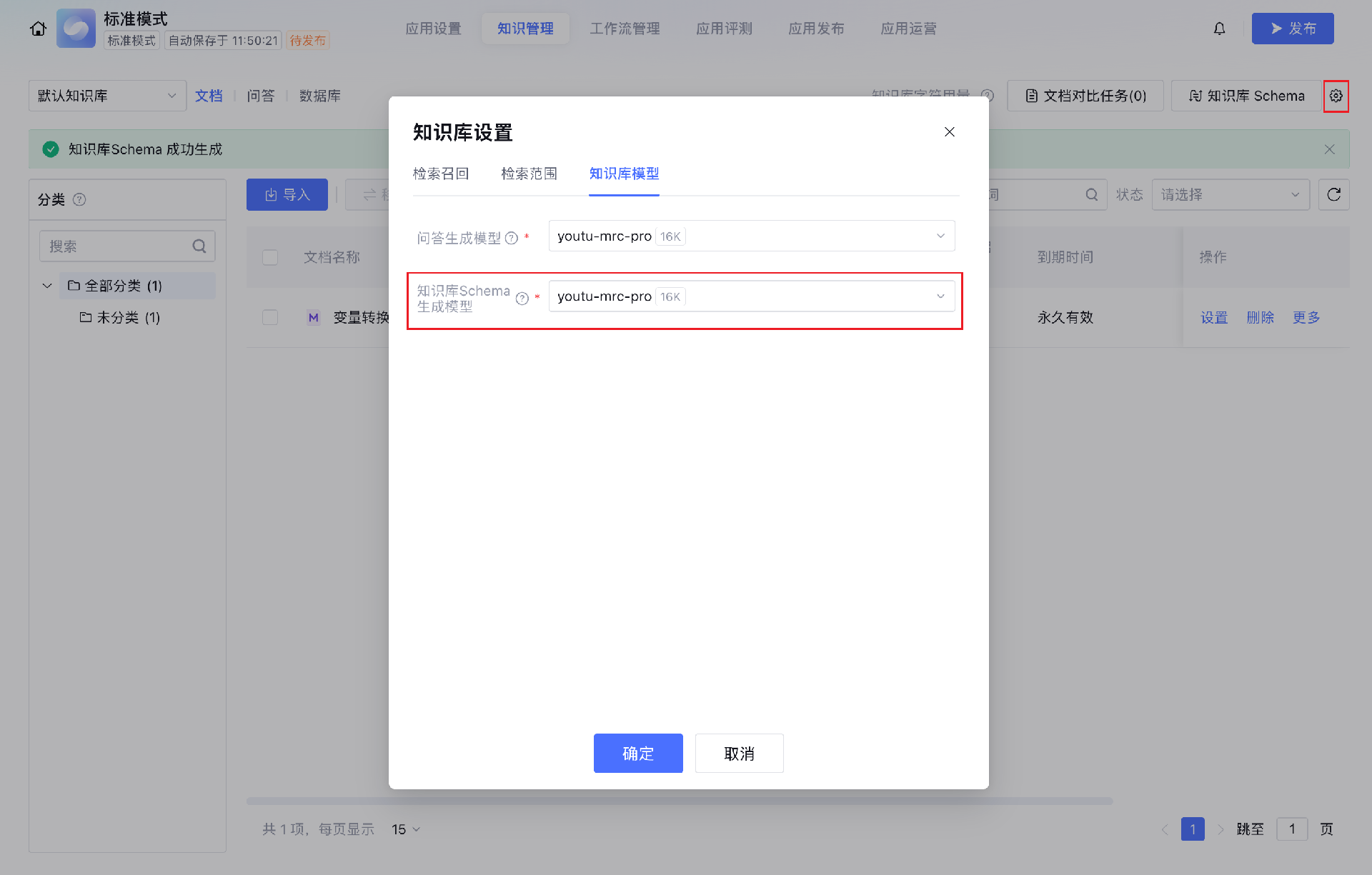 单击知识库设置,可调整知识库 Schema 生成模型。