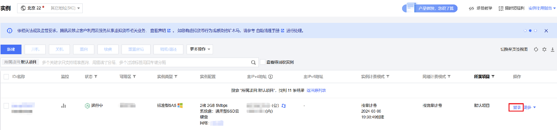 找到需要登录的 Windows 云服务器,单击右侧的登录。如下图所示: