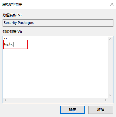 4. 在编辑多字符串对话框中,增加 tspkg 字符,单击确定。如下图所示: