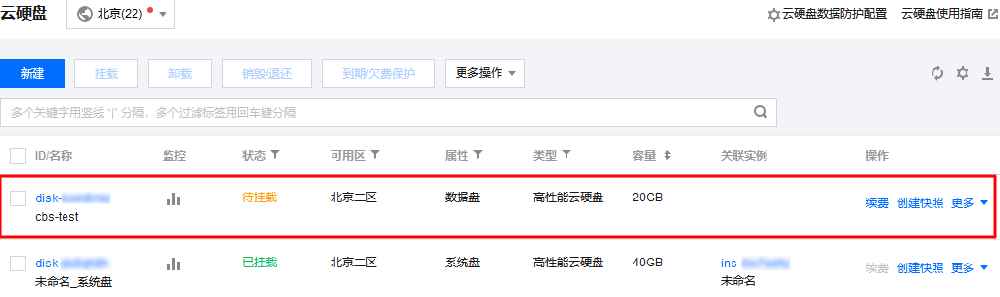 返回云硬盘列表页,可查看已购买的弹性云盘 cbs-test,并显示为待挂载状态。如下图所示: