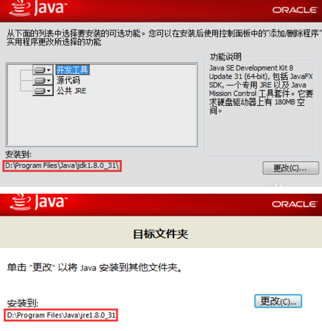 根据提示一步步安装,安装过程中可以自定义安装目录(默认安装到 C 盘),例如我们选择的安装目录为:D:\Program Files\Java\jdk1.8.0_31