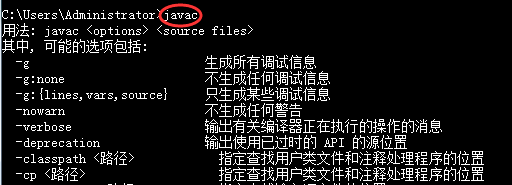 测试配置是否成功:单击开始(或快捷键:Win+R)> 运行(输入 cmd)> 确定(或按 Enter 键),输入命令 javac 并回车。若出现如下图所示信息,则说明环境变量配置成功。