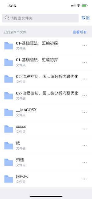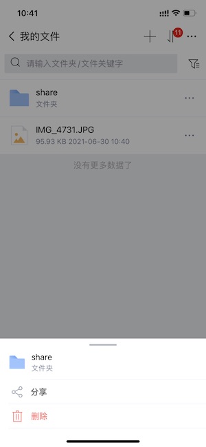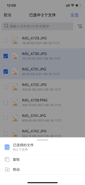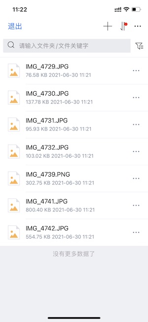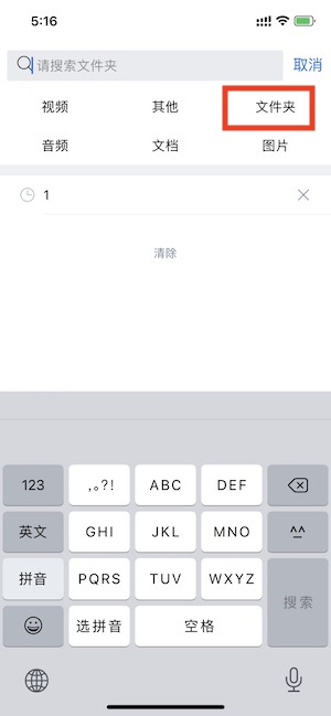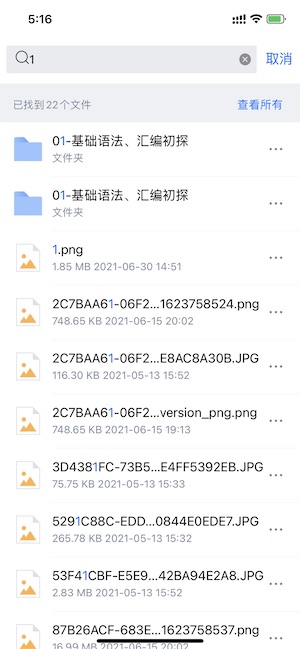 移动端提供了模糊搜索、按照类型搜索的功能,您可以使用搜索前缀关键词,搜索当前文件夹以及子文件夹下指定前缀的文件,也可以先指定要搜索的文件类型,在该类型下搜索。