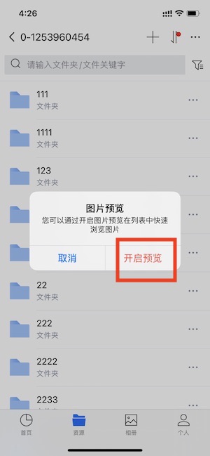 在您首次启动 App 并且进入文件列表页时,App 会检测当前列表页是否有图片。如有,则弹出开启图片预览的提示窗,您可以点击开启预览,快速打开图片预览功能;如不需要,可点击取消忽略。后续如需使用,可前往个人 > 设置中手动开启。