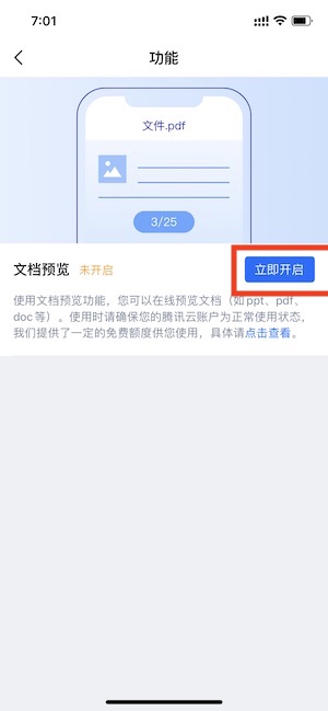 1. 点击要预览的文档,如果尚未开启文档预览功能,则会进入文档预览功能配置页面,点击立即开启,即可开启文档预览。