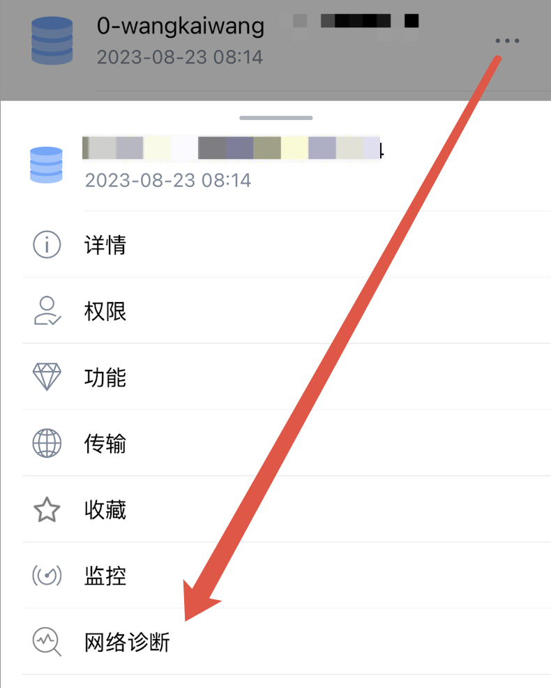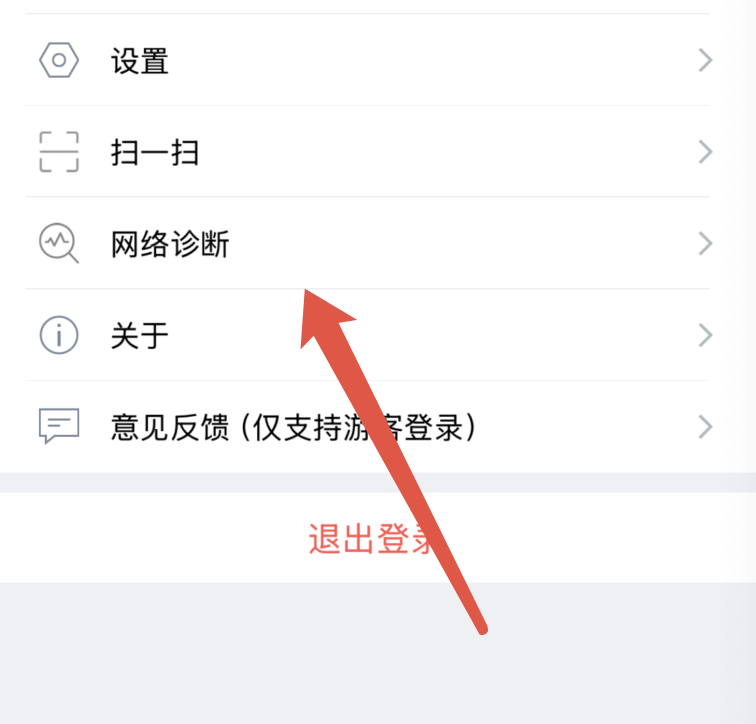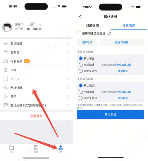1. 安装成功后登录 APP,单击底部 Tab 栏个人,选择网络诊断 > 传输测速。
