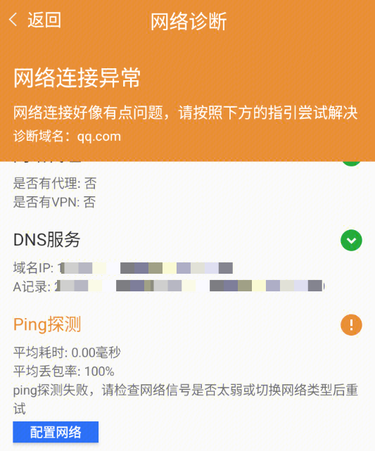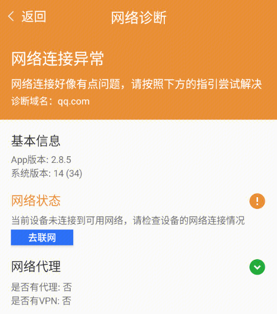 将检测当前设备的网络是否打开以及信号强度、是否配置了代理或使用 VPN,并给出结论和建议。