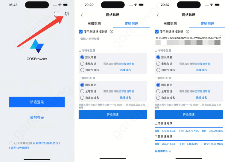 下载安装 COSBrowser APP 测速,无需登录,安装打开即可。在登录页面右上角单击诊断按钮,进入传输测速页面,粘贴测速链接并单击开始测速。