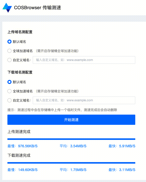 传输测速可以对多种类型的 COS 域名进行真实的上传、下载操作,检测上传、下载过程中可能遇到的问题,并记录上传、下载的速度。