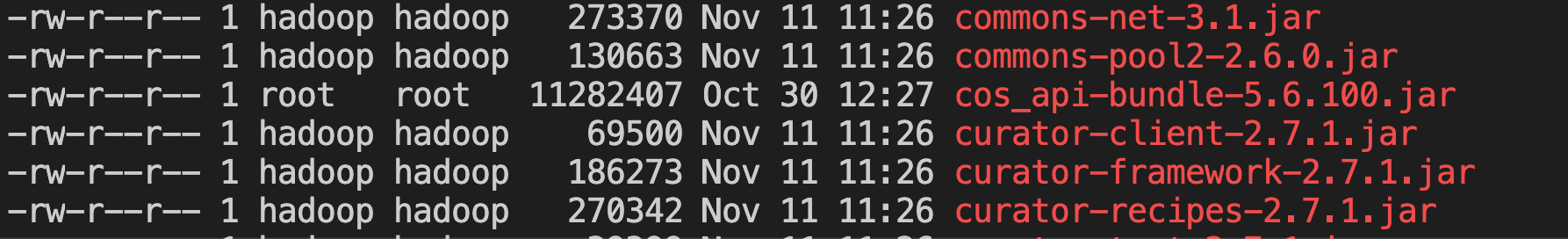Hadoop-COS jar 和 cos_api-bundle jar 两个 jar 包必须放置在运行命令 hadoop classpath 指定的其中一个路径下,如/usr/local/services/hadoop/share/hadoop/tools/lib/。路径下目录名称(例如 .../services/... 或 .../service/... )以客户端默认配置为准。