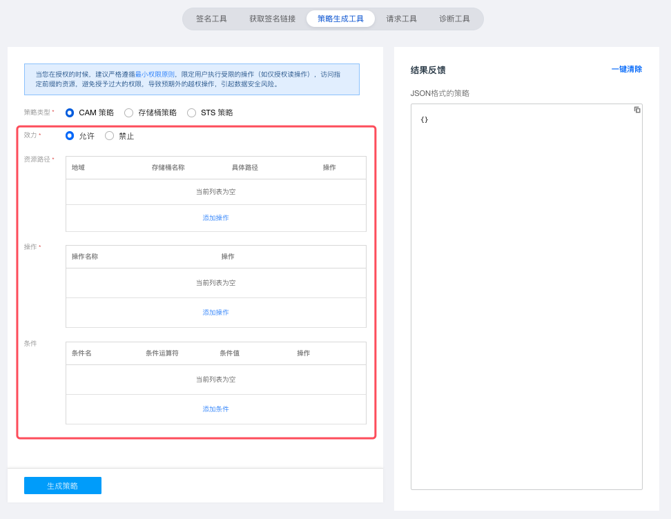 本策略生成工具不识别和提示您填写的错误参数。若您生成的 JSON 格式策略需要实际生效,请务必按照您的业务需求进行准确填写。