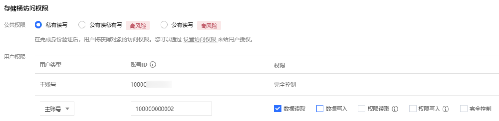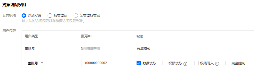 对对象设置 ACL以下示例表示允许另一个主账号对某个对象有读取权限,具体操作指引请参见 设置对象的访问权限。