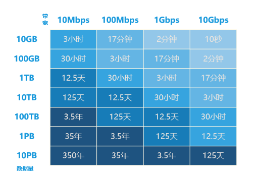 用户可依据数据迁移量、IDC 出口带宽、IDC 空闲机位资源、可接受的迁移完成时间等因素来考虑如何选择迁移方式。下图展示的是使用线上迁移时预估的时间消耗,可以看出,若此次迁移周期超过10天或者迁移数据量超过50TB,我们建议您选择 云数据迁移 CDM 进行线下迁移。