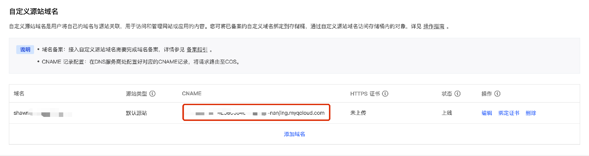 您需要在服务商处为您的自定义域名添加 CNAME 记录,并指向上述域名添加步骤中对应的 CNAME 记录。关于配置域名解析的更多介绍请参见 附录:配置域名解析。