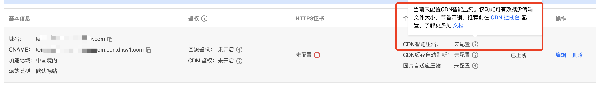 若显示“未配置”,指未开启 CDN 智能压缩配置状态。